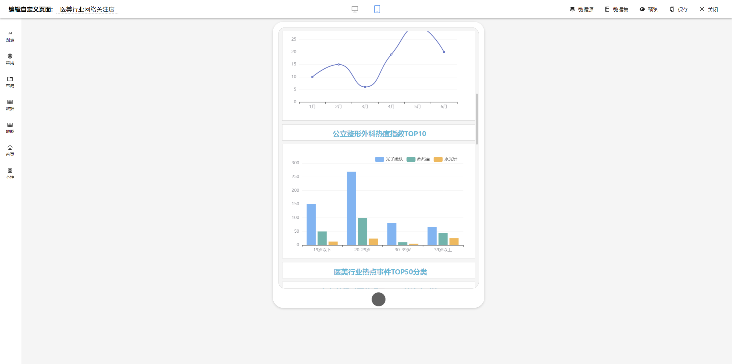 - 支持 ECharts,目前支持28种图表,在线拖拽设计,支持SQL和API两种数据源