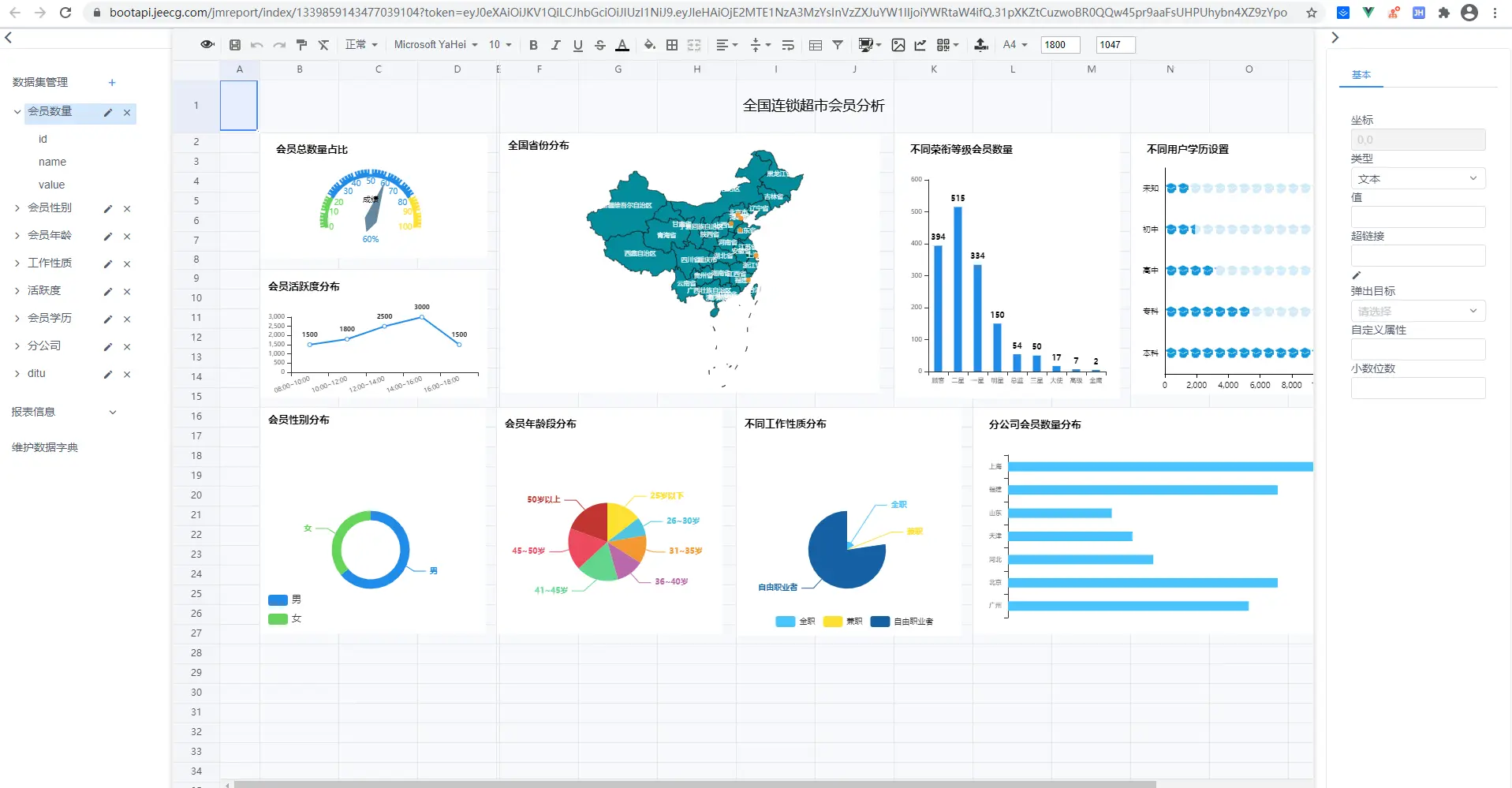 - Web版报表设计器,类Excel操作风格,通过拖拽完成报表设计,所见即所得。