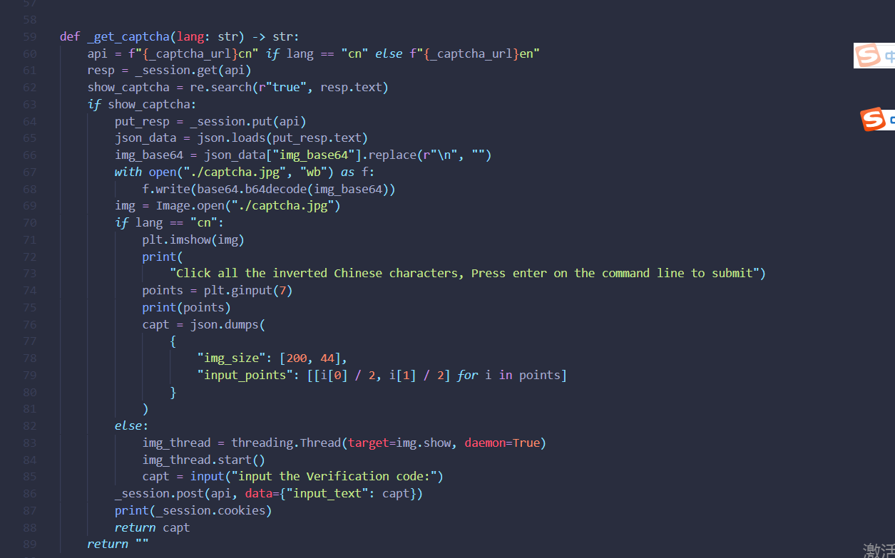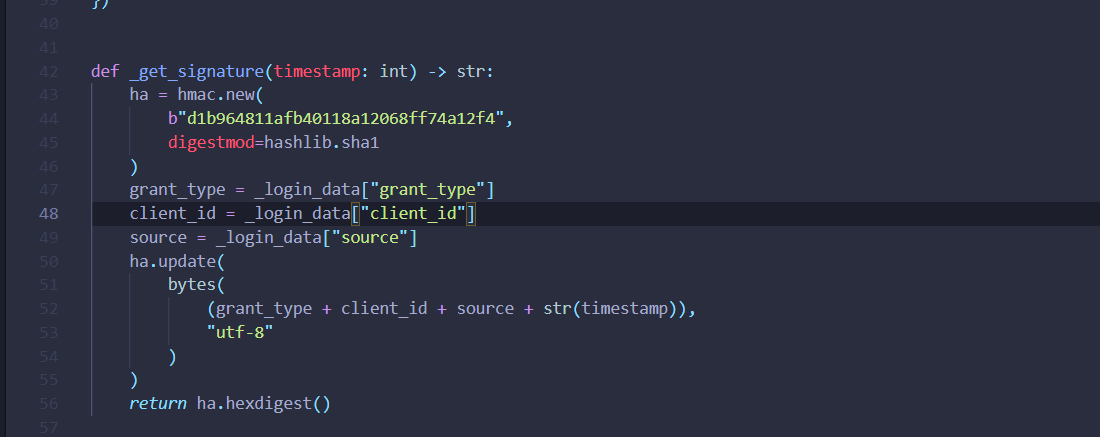 具体的思路如图所示,使用sha-1作为hash函数,key是写死的,使用其他四个参数值作为message进行加密,整理思路可以用python表达出来def _get_signature(timestamp: int) -> str: ha = hmac.new( b"d1b964811afb40118a12068ff74a12f4", digestmod=hashlib.sha1 ) grant_type = _login_data["grant_type"] client_id = _login_data["client_id"] source = _login_data["source"] ha.update( bytes( (grant_type + client_id + source + str(timestamp)), "utf-8" ) ) return ha.hexdigest()分析完signature参数之后,我们接着来分析captcha参数