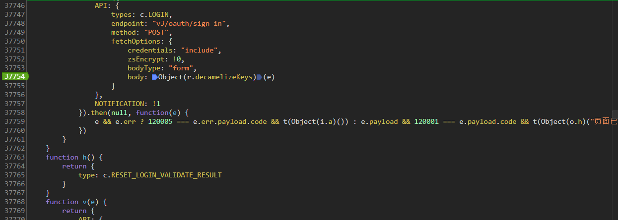clientId: "c3cef7c66a1843f8b3a9e6a1e3160e20" 多次试验,写死的 grantType: "password" 非第三方登陆的话都是这个值 lang: "en" 针对不同验证码类型 password: "asdd" 密码 refSource: "people" 不变 source: "com.zhihu.web" 不变 timestamp: 1575300515085 时间戳 username: "+8617610771895" 用户名 utmSource: undefined 不变到这里我们关于decamelizeKeys加密方法的e参数已经分析好了,t参数还未知,那我们就继续从刚才decamelizeKeys函数那里继续往下找,分析decamelizeKeys函数的加密逻辑