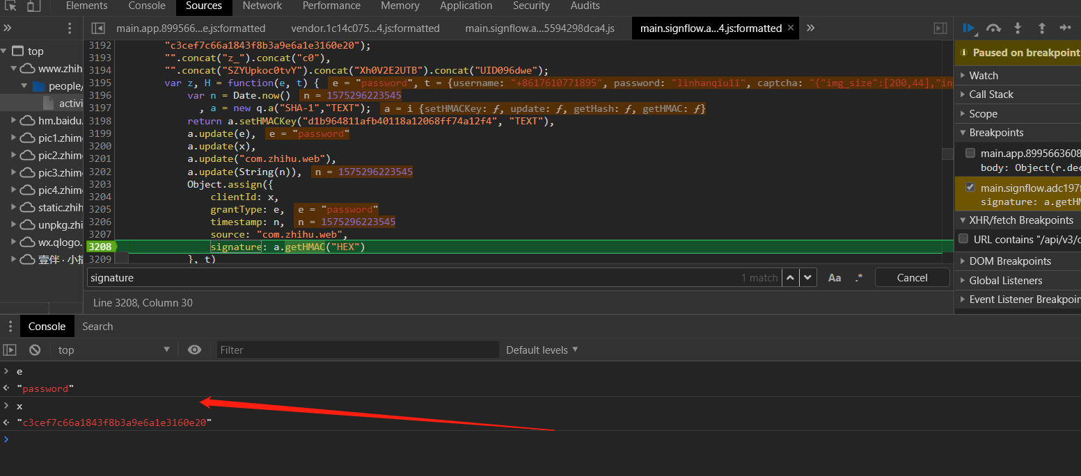 captcha: "mdgv" clientId: "c3cef7c66a1843f8b3a9e6a1e3160e20" grantType: "password" lang: "en" password: "asdd" refSource: "people" signature: "f45d273cd16f4f80e4fee3434d1c3009fb2248cf" source: "com.zhihu.web" timestamp: 1575300515085 username: "+8617610771895" utmSource: undefined我们分析,captcha和signature这两个参数相对其他参数来说还是比较重要,因此我们着重分析这两个参数