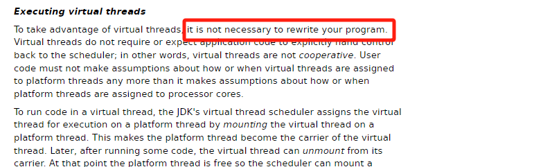 先看下说明,为了方便用户使用,JDK提供了一系列使用虚拟线程的API,并且兼容之前线程的使用方式,无需为使用虚拟线程而重写应用程序。