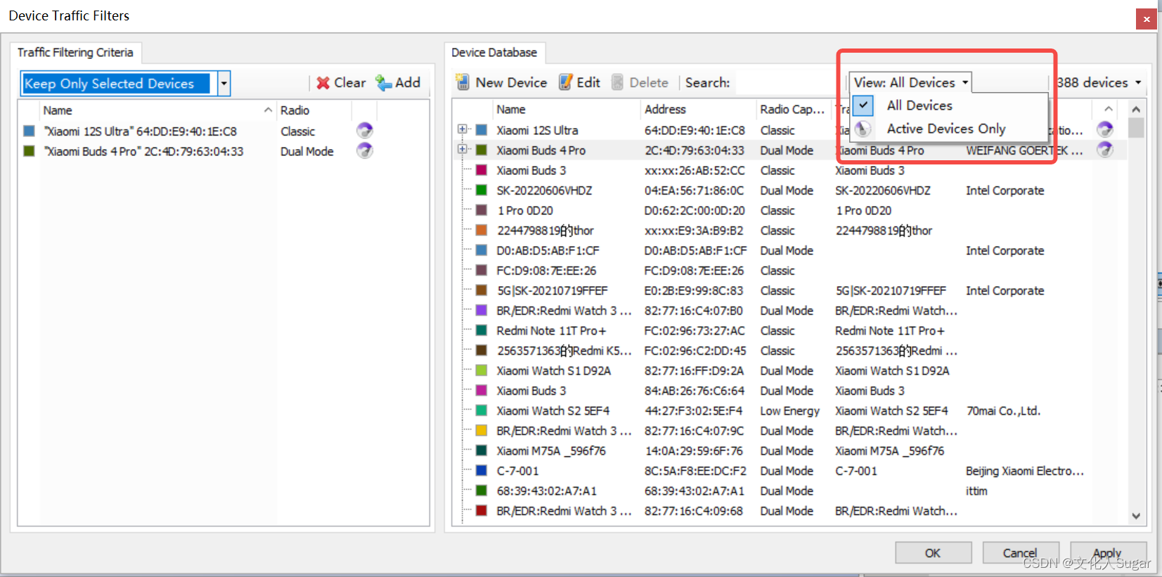 - 如果左侧过滤的设备里只有1个,keep only selected device和keep invoiving selected device区别不大,keep invoiving能看到inquiry scan包。如果一个设备和多个设备连接,我们只想看其中两个设备的通信数据,可以将两个设备添加到左边并选择keep only