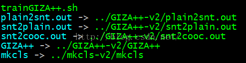 编译完后,看到产生了多个可执行文件:mkcls,GIZA++,snt2cooc.out,plain2snt.out, snt2plain.out,同时看到有一个运行脚本trainGIZA++.sh。为方便使用,可以把这些可执行文件集中到一个bin文件夹中。