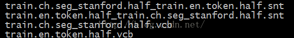 plain2snt.out工具是用来得到词汇表vcb的,调用方法:./plain2snt.out train.ch.seg_stanford.half train.en.token.half,运行后出现4个新文件。