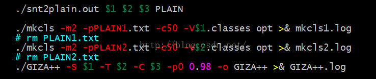 trainGIZA++.sh所需要的三个参数都有了,就可以跑了。修改脚本中每个可执行程序的路径,调用该sh,由于时间比较长,使用nohup提交比较合适: