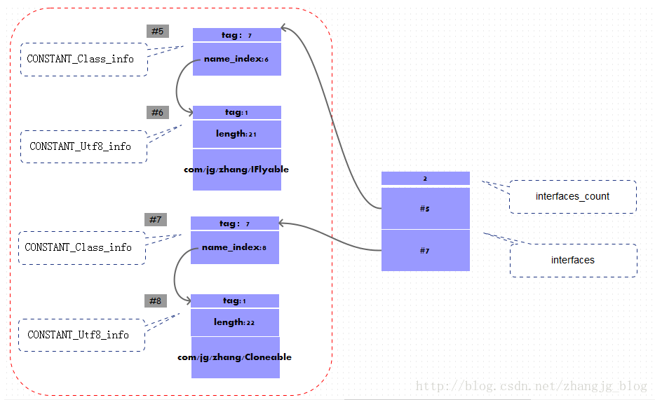 这四项数据就是当前的Plane类所实现的接口的信息。 第五项和第六项描述了Plane所实现的IFlyable接口, 第七项和第八项描述了Plane所实现的接口Cloneable接口。 下面是示意图(其中虚线范围内表示常量池的区域):