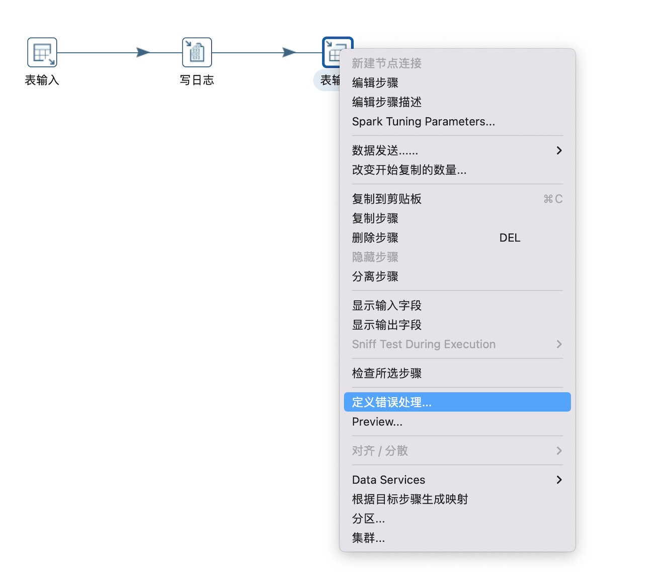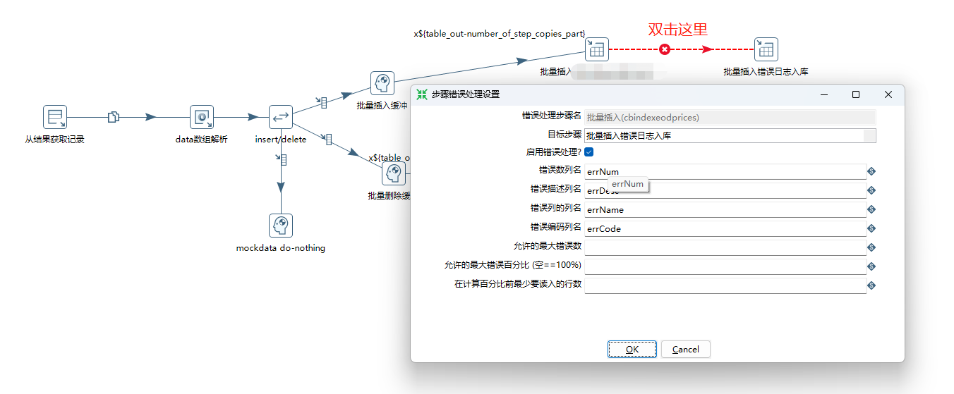 目标步骤:错误处理信息流向的下一个步骤,如表输出或者写日志等。