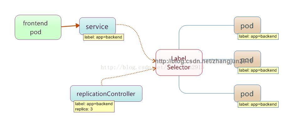 可以看到,service和replicationController只是建立在pod之上的抽象,最终是要作用于pod的,那么它们如何跟pod联系起来呢?这就要引入label的概念:label其实很好理解,就是为pod加上可用于搜索或关联的一组key/value标签,而service和replicationController正是通过label来与pod关联的。如下图所示,有三个pod都有label为"app=backend",创建service和replicationController时可以指定同样的label:"app=backend",再通过label