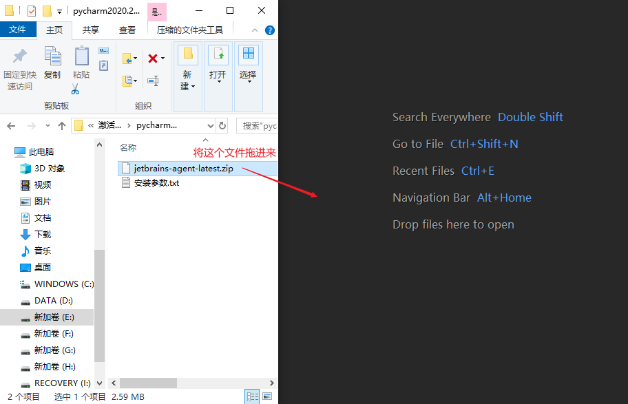 解压之后共有两个文件,先将zip结尾的压缩包拖动到Pycharm的界面中