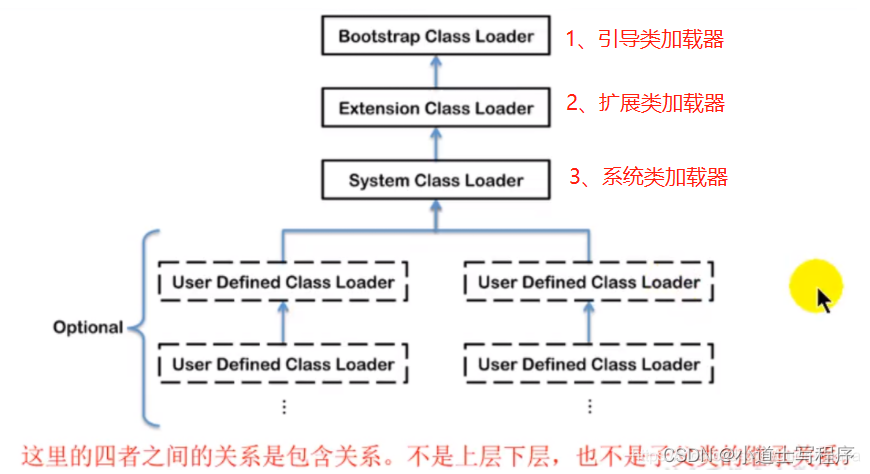 1、如果一个类加载器收到了类加载请求,它并不会自己先去加载,二十把这个请求委托给父类的加载器去执行;