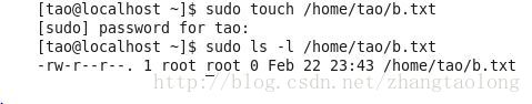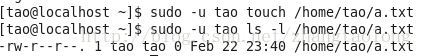 上面的命令是使用sudo切换成tao用户,然后以tao的身份创建a.txt文件,注意a.txt的所有者是tao。第一次使用
