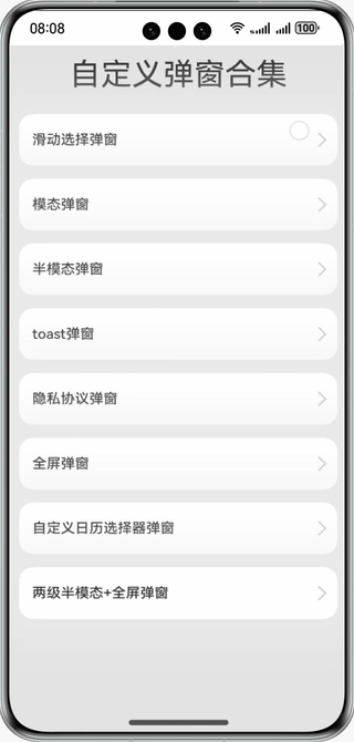 本示例使用自定义弹窗(CustomDialog)、全屏模态转场(bindContentCover)、半模态转场(bindSheet)等实现多种自定义弹窗。