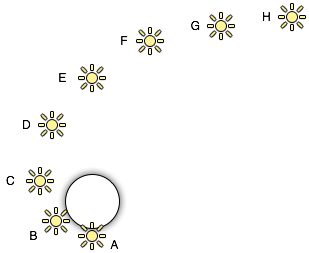 比如,如果一个物体的渲染被如图2.1所示的A—H的光源影响。假设A到H的光源都有同样的颜色和强度并且渲染模式都是Auto,那么这些光源将按照距离远近的顺序进行排序最后渲染。最近的光源,也即是最亮的光源将被作为逐顶点渲染
