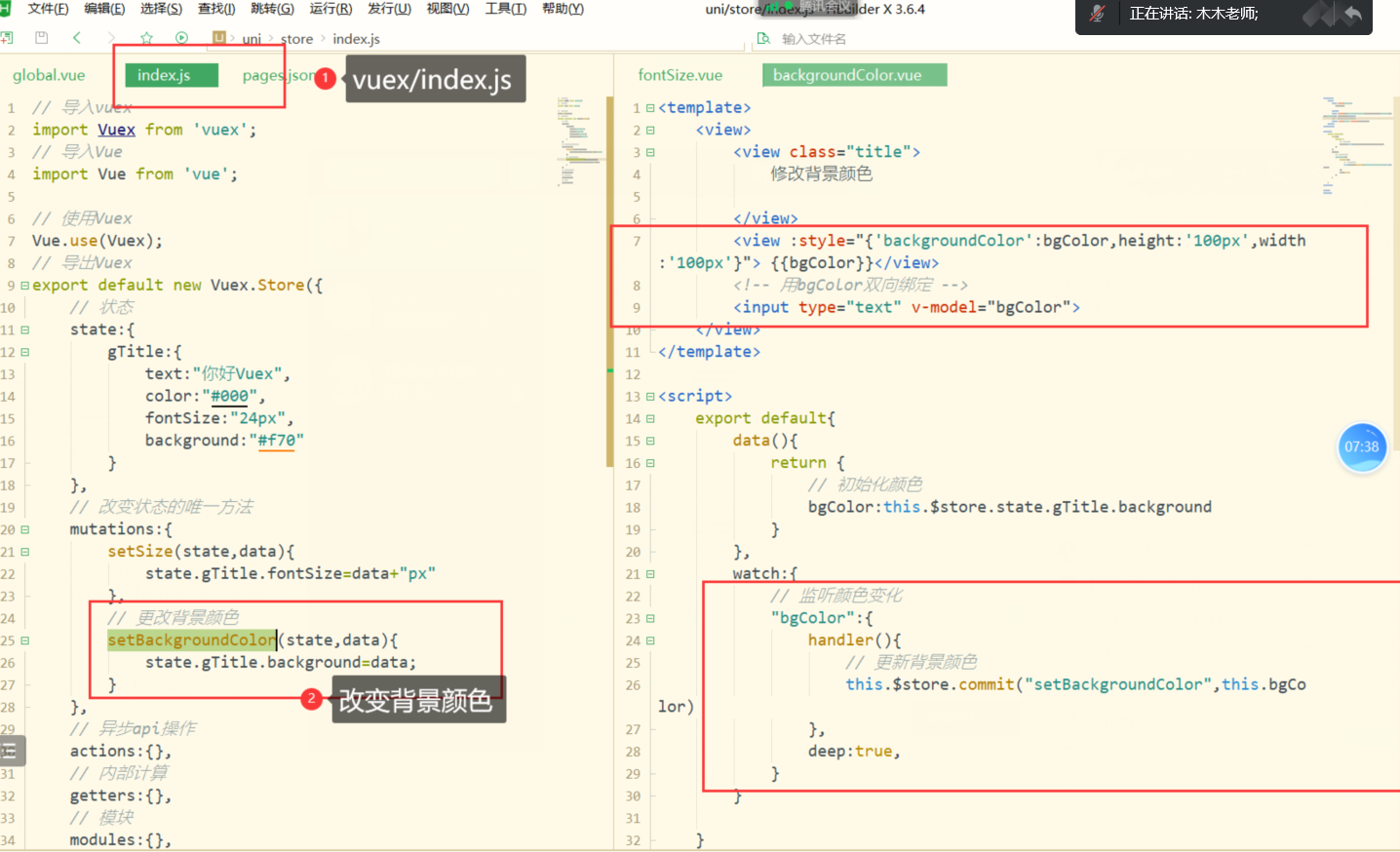 mutations是改变state数据的唯一途径,在index.js的mutations模块中设置改变state数据的方式setFontSize(state,data){state.gTitle.fontSize=data+"px"},在页面使用时this.$store.commit("setFontSize",e.detail.value),简写方式为引入import {mapMutations} from 'vuex',定义methods:{...mapMutations(["setFontSize"])} ,使用 this.setFontSize(100)。