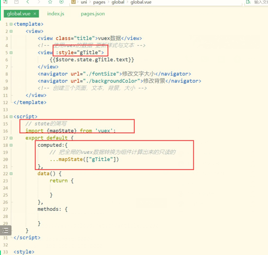 在页面中进行使用时$store.state.gTitle.text。引用时也可以使用简写形式,首先引入state的简写import {mapState} from 'vuex',其次在computed模块内把全局的vuex数据转换为组件只读的数据...mapState{["gTitle"]},最后可以直接使用gTitle进行引用。