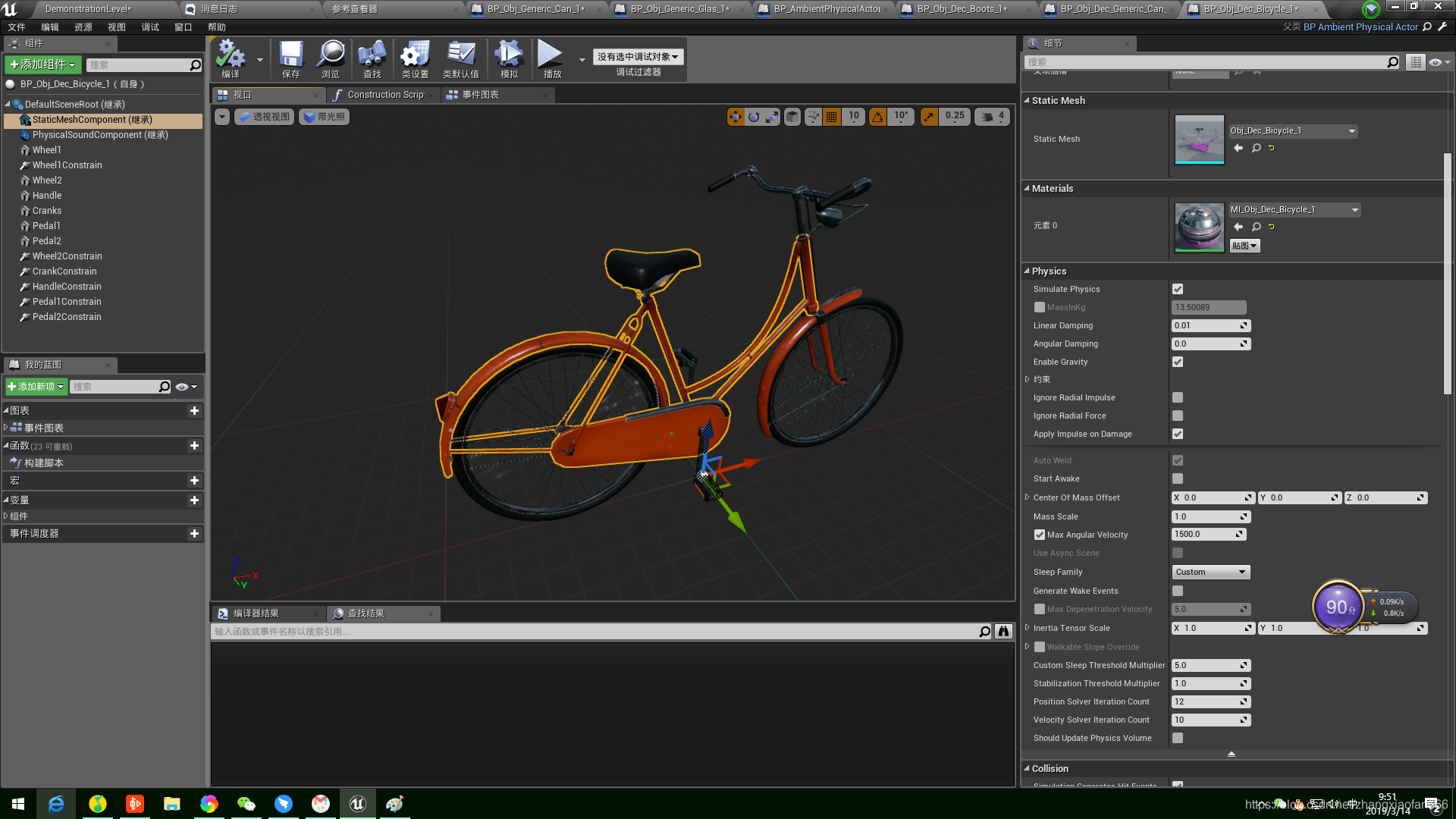 后面几个Physics Constraint Component是将两个脚踏板和铁杆相连,铁杆和车身相连,这样在游戏中才能看到车子倒地,车踏板还在车子上转动效果