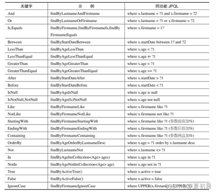 从代码可以看出,这里使用了findBy、Like、And这样的关键字。其中findBy可以用find、read、readBy、query、queryBy、get、getBy来代替。