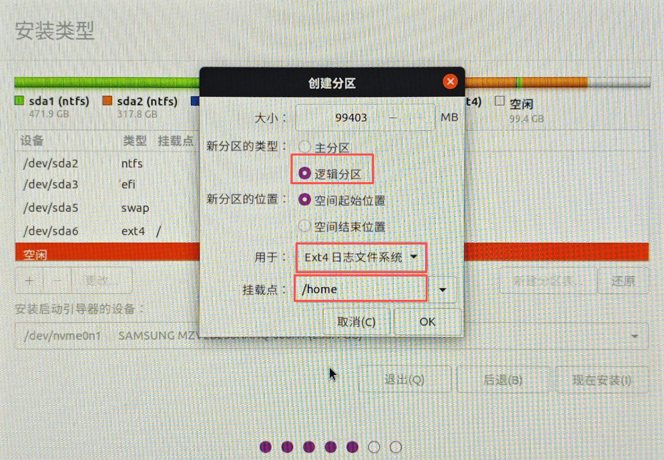 剩余全部空间,相当于其他盘,逻辑分区,空间起始位置,/Home,Ext4日志文件系统