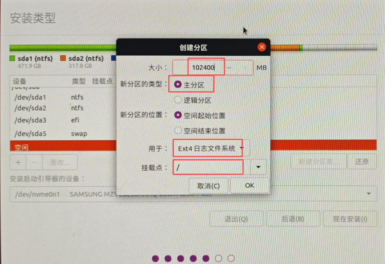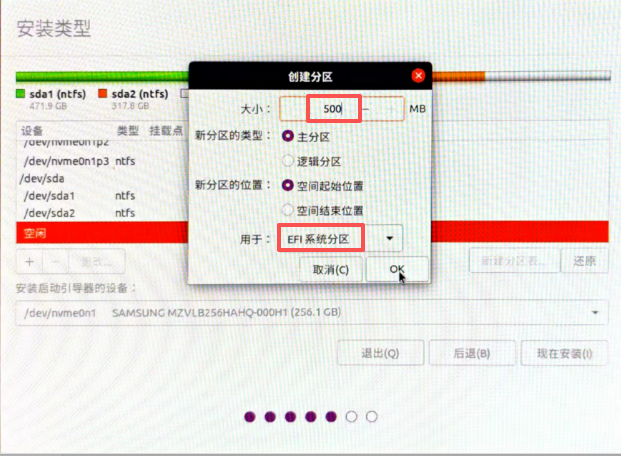 大小200-500M即可,主分区,空间起始位置,EFI系统分区