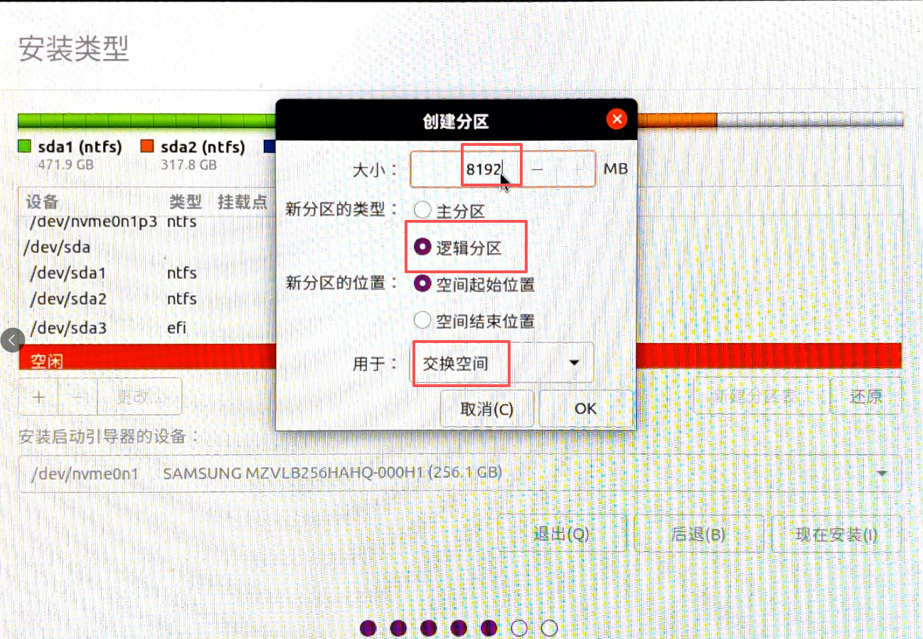 大小8192M(8G够用),逻辑分区,空间起始位置,交换空间,