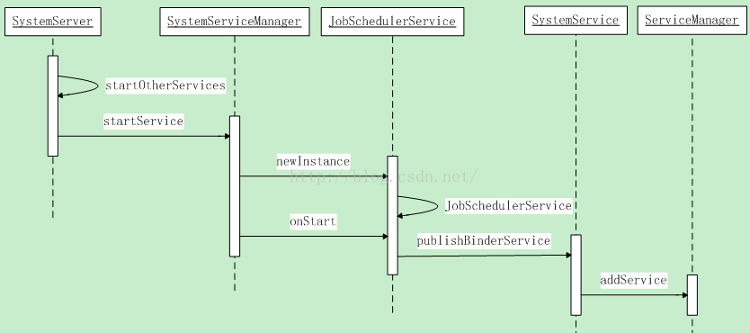 由于JobSchedulerService是系统服务,故这里按照启动流程和使用流程分开分析源码,下面先看下启动流程的时序图: