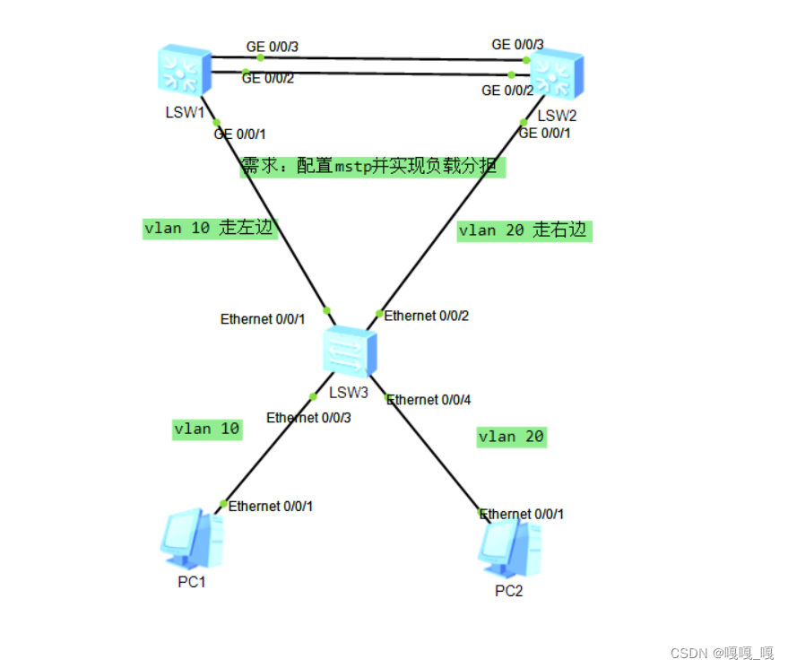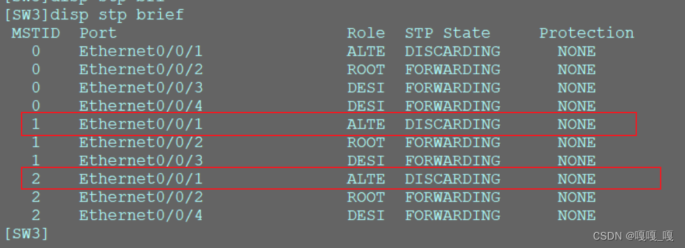 [SW1]stp mo mstp //模式为mstp,不过ensp默认就是mstp