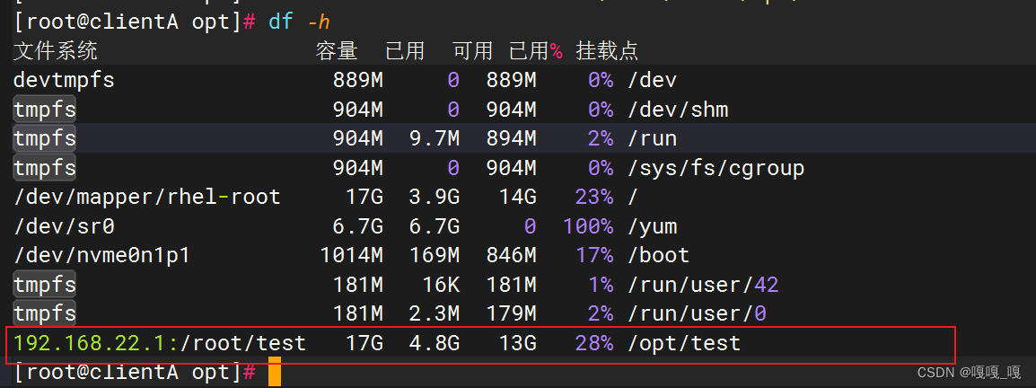 [root@clientA opt]# mount -t nfs 192.168.22.1:/root/test /opt/test // -t 指定挂载类型