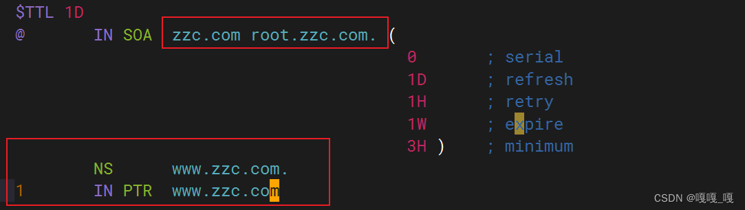 [root@serverA named]# cp named.localhost zzc.zone //复制正向区域的模板