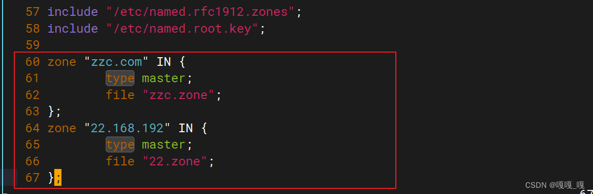 60 zone "zzc.com" IN { //在最下面添加此内容