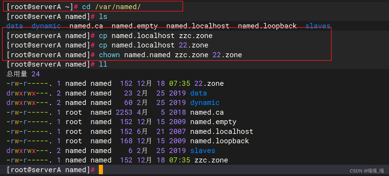 [root@serverA named]# chown named.named zzc.zone 22.zone //修改拥有人和拥有组