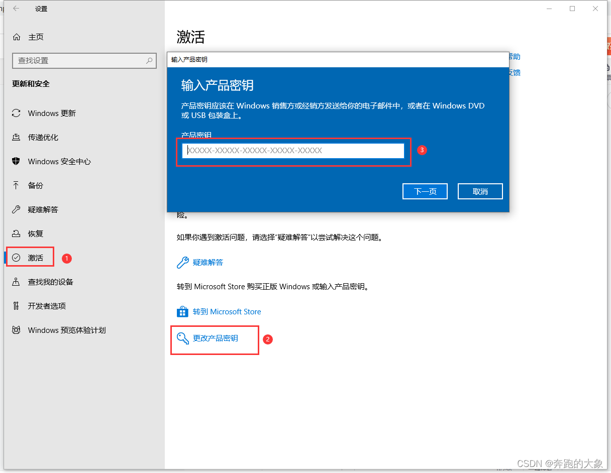 操作步骤:开始菜单,设置,激活,更改产品密钥