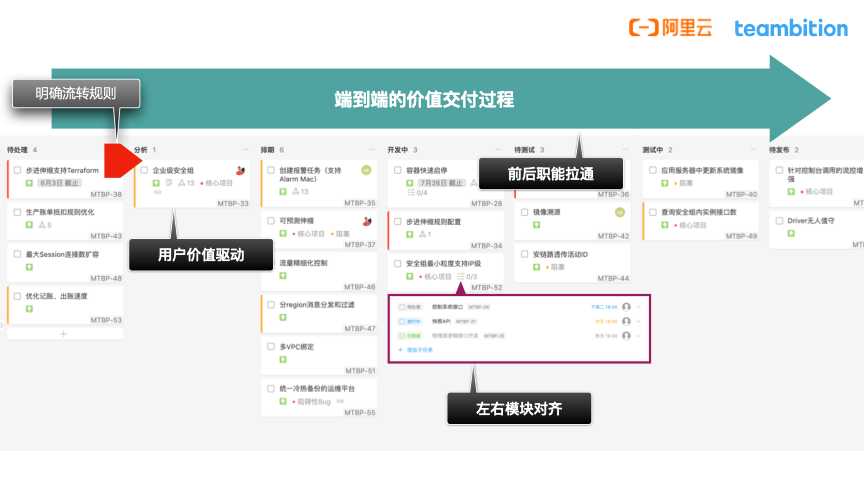 通过这个看板我们可以看到需求流动的整个过程,看到需求被拆分成多个任务以及团队协作完成任务的过程。它帮助团队暴露和发现问题,促进团队更好地协作交付需求。为团队的高效协作和价值的顺畅流动奠定了基础。