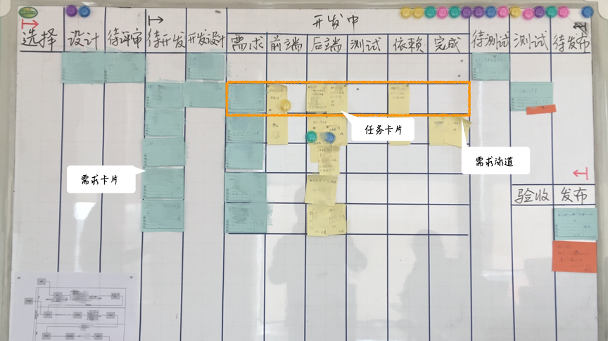 让我们看一个例子。下图是阿里天猫新零售团队两年前的看板。这个看板从左到右分成了多个列,每列代表一个阶段。看板上蓝色的卡片是需求,它们从左到右,依次经过各个列,其中包括:选择、设计、待评审、待开发、开发设计、开发中、测试等阶段,一直到发布。