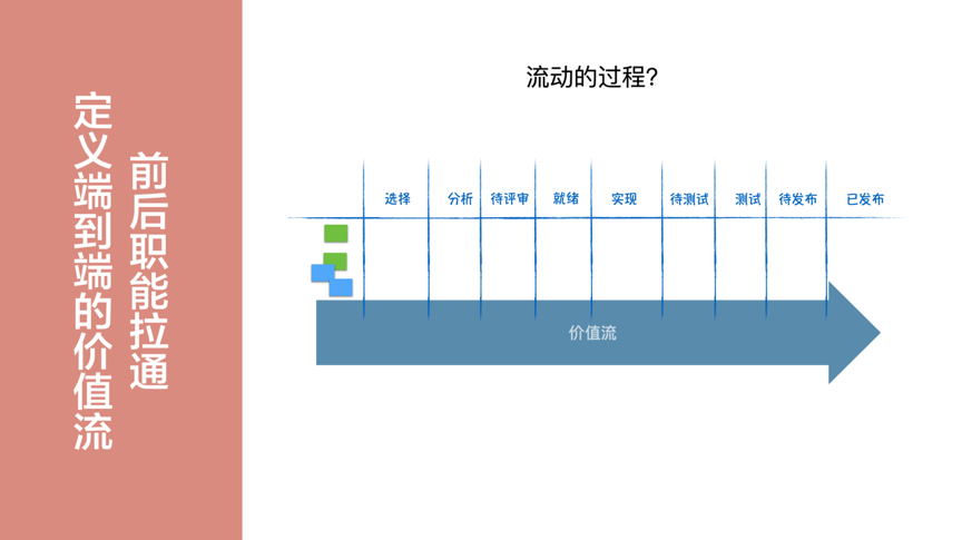 端到端的价值流动过程,涉及不同的职能,如产品设计、交互视觉、开发和测试等。为了提升流动效率,必须拉通组织中的各个职能,实现整个过程的可视化。