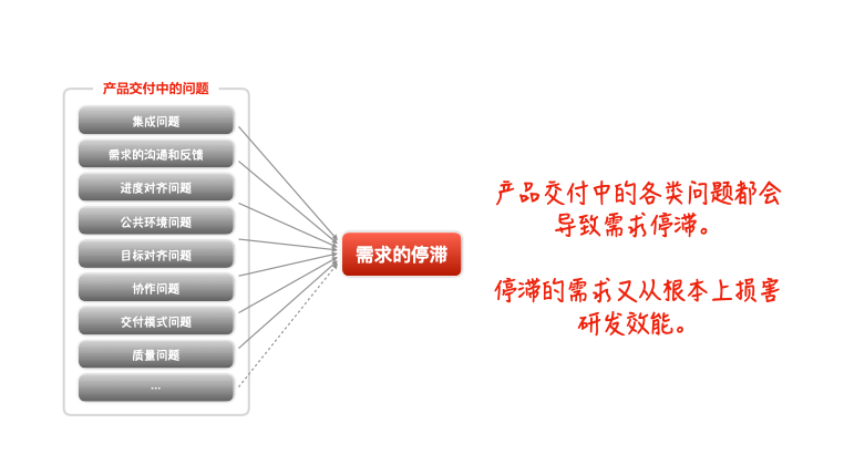 产品交付中的各类问题会导致需求的停滞,停滞的需求阻碍了价值的顺畅流动,从根本上损害了研发效能。
