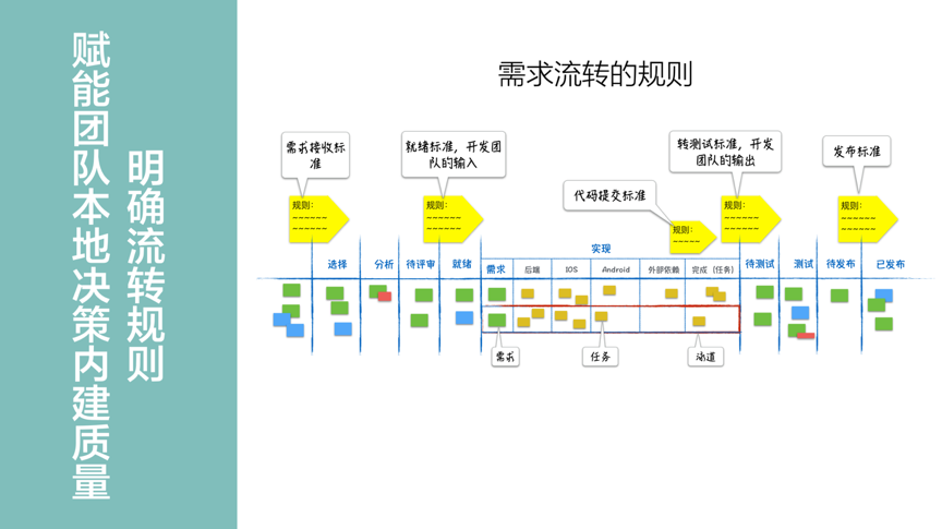 明确流转规则帮助团队做到内建质量。所谓内建质量,是让需求在每一个阶段的质量,都得到有效地保证,避免问题在最后的阶段集中爆发,和避免不必要的返工,这也是持续顺畅价值流动的基础。