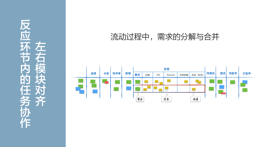 这就是我们说的:左右模块对齐,也就是任务向需求对齐,尽早交付需求。它促进团队以需求交付为牵引,更有效的协作,并帮助团队发现影响需求交付的瓶颈。