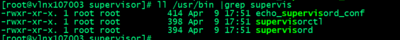 supervisor安装完成后 /usr/bin下 会生成三个执行程序:supervisord、supervisorctl、echo_supervisord_conf,分别是supervisor的守护进程服务(用于接收进程管理命令)、客户端(用于和守护进程通信,发送管理进程的指令)、生成初始配置文件程序。