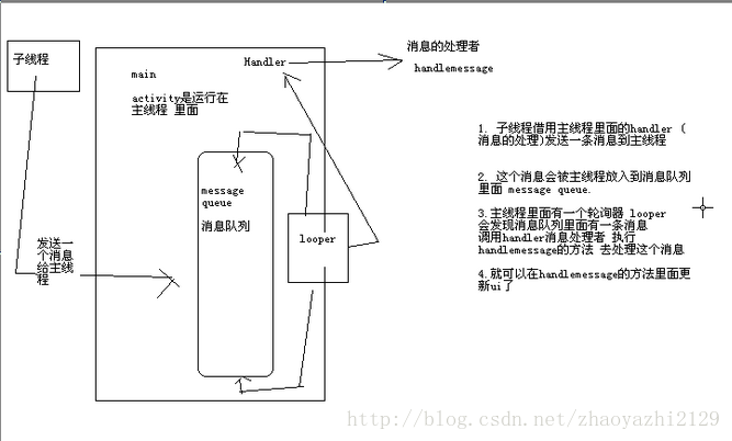 所有的UI线程要去负责View的创建并且维护它,例如更新冒个TextView的显示,都必须在主线程中去做,我们不能直接在UI线程中去创建子线程,要利用消息机制:handler,如下就是handler的简单工作原理图: