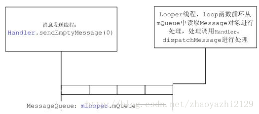 从这个图中我们很清楚可以看到调用sendEmptyMessage后,会把Message对象放入一个MessageQueue队列,该队列属于某个Looper对象,每个Looper对象通过ThreadLocal.set(new Looper())跟一个Thread绑定了,Looper对象所属的线程在Looper.Loop方法中循环执行从MessageQueue队列读取Message对象,并把Message对象交由Handler处理,调用Handler的dispatchMessage方法。