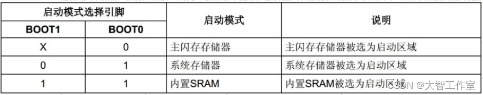 SRAM启动方式,一般用于程序调试(程序只下载到内存,掉电后重启,程序数据丢失)。调试可以考虑从这个模式启动代码(也就是STM32的内存中),免得反复擦除flash。等程序调试完成后,在将程序下载到flash中(需要将boot0=boot1=0重新下载)。