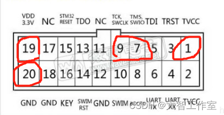 图是stlink的接口图,开发板开始没自己供电电,则使用19脚的3.3伏供电,然后下载的时候就出现上图的错误。