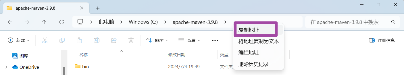 随后,将压缩包解压到某一个目录中,建议放在一个简短的路径中;这个路径相当于就是后续Maven的安装路径,如下图所示。随后,复制一下这个路径。