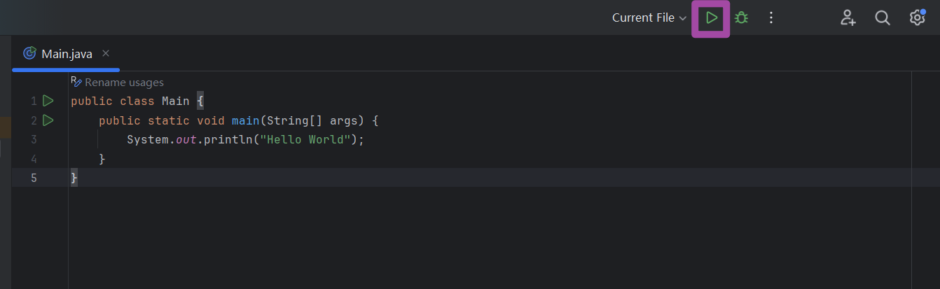 我们可以将上述代码全部清除,然后手动写一个最简单的Java代码,从而更好地体验IDEA中代码的撰写。例如,我们就可以写一个非常简单的Hello World程序,代码如下。