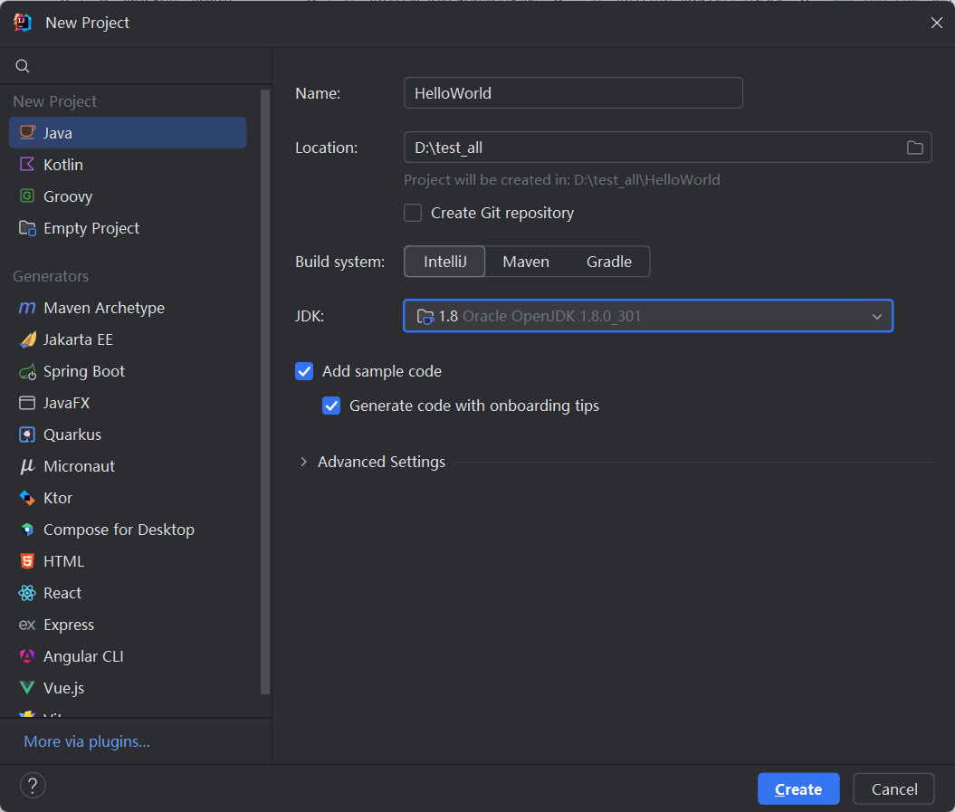 首先,如果我们选择了新建项目,那么就会弹出如下图所示的窗口。在其中,我们需要部署项目的名称、保存路径、构建方式、JDK版本等信息。我这里的配置选择如下。