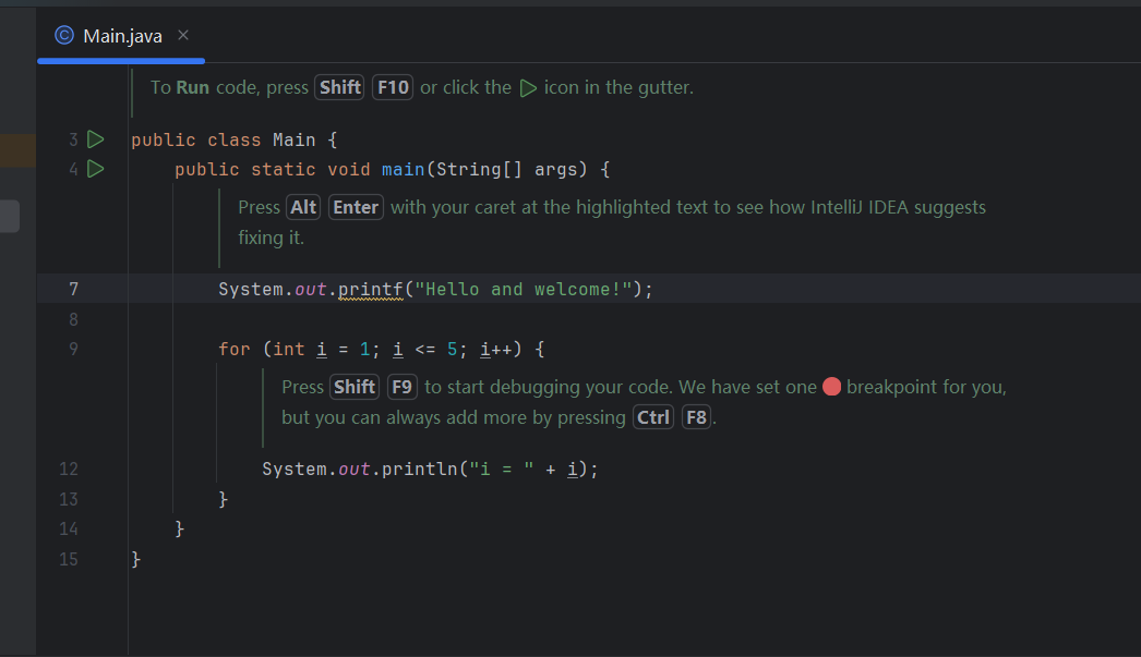 从上图也可以看出来,我们当前界面中已经有一个简单的实例代码了,其已经为我们定义好了类和main()方法,如下图所示。之所以会这样,是因为我们在上上图中选择了“Add sample code”选项,即软件会自动为我们生成这样一个示例代码。