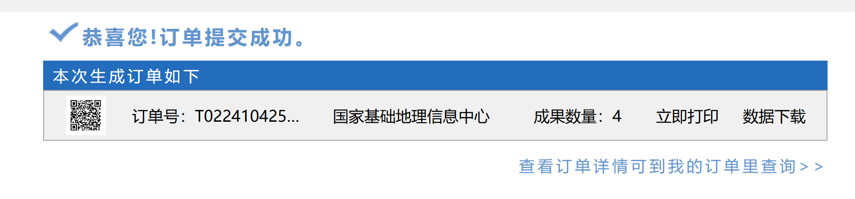 接下来,即完成了订单的提交,如下图所示。随后,不需要审核,我们直接就可以选择“数据下载”。