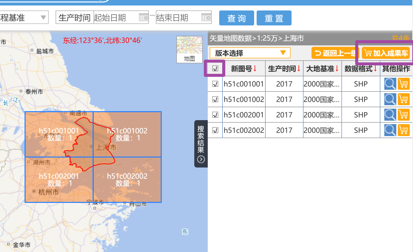 其中,可以手动选择对应的分幅,并选择“加入成果车”,如下图所示。