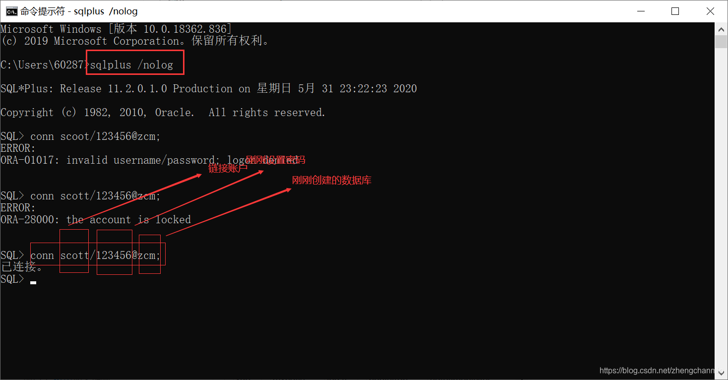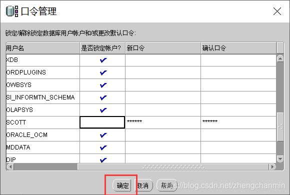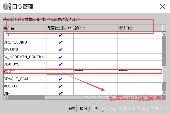 使用scott用户登录,第一次登录的时候会显示账户锁定,需要将账户解锁: